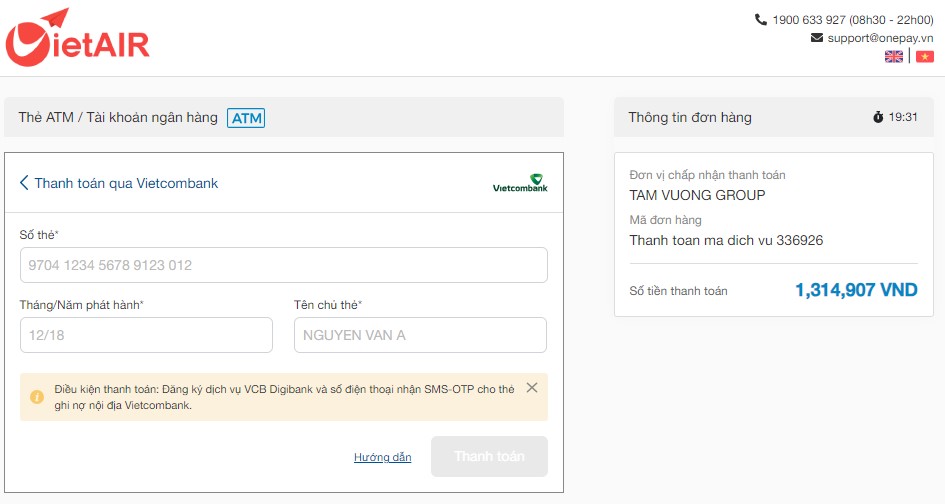 Sau khi đặt vé trên VietAIR, chọn phương thức thanh toán bằng thẻ nội địa qua cổng thanh toán OnePay.