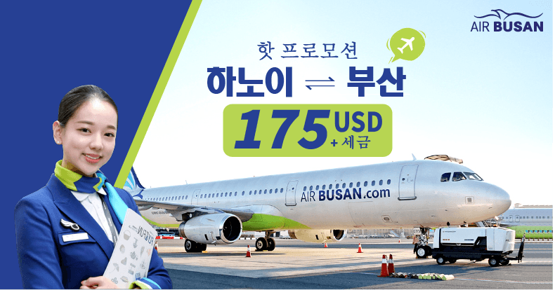한국의 부산은 바닷가가 있는 아름다운 관광도시입니다.올여름에 에어부산을 타고 비엣에어에서 제공하는 특별 프로모션이 진행됩니다. 하노이-부산 왕복 특별요금 175USD+세금